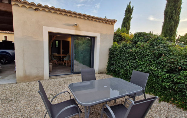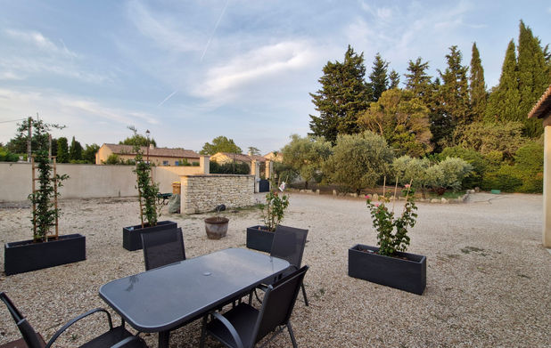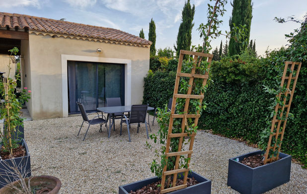 Concernant l’extérieur, le jardin privatif dispose d’une grande table avec chaises, barbecue, parasol, avec vue sur les oliviers.